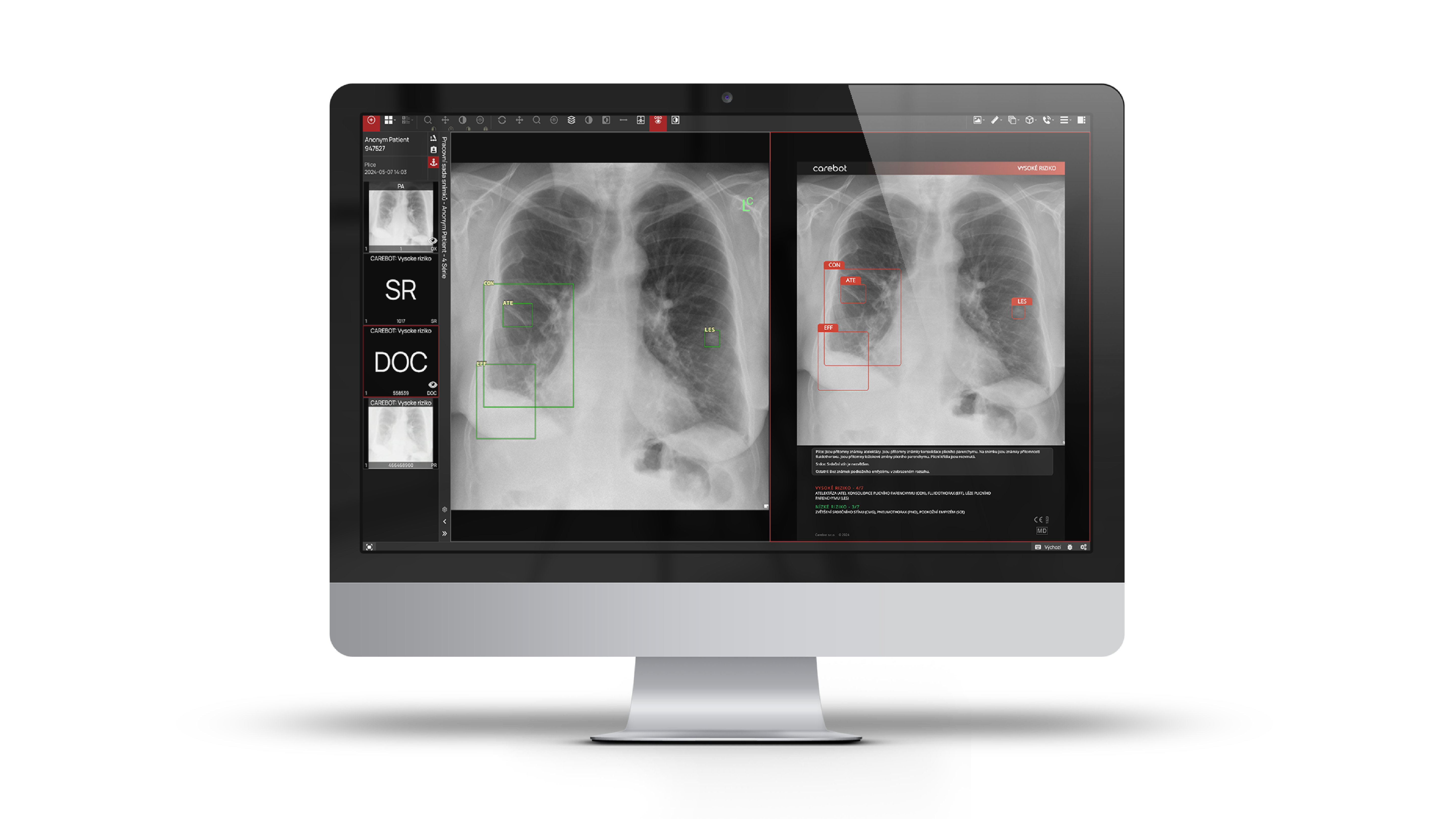 Carebot analyses chest X-rays using artificial intelligence. The unique software detects the following findings with high accuracy: lung lesions, consolidation, pneumothorax, fluidothorax, cardiac shadow enlargement, atelectasis and subcutaneous emphysema.